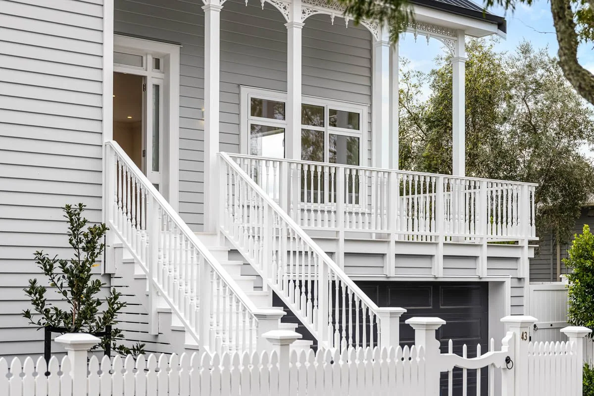This relocated Pt Chevalier villa was stripped back to its framing and completely rebuilt to bring new life to a classic form. The project carefully preserves the charm of a traditional villa while introducing a light, modern aesthetic that feels calm, refined, and effortless.